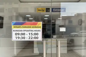 Rental agencies display modified Ramadan hours — always confirm before arrival