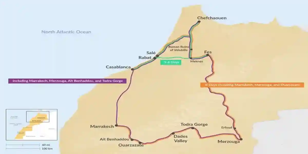 Day 1: Marrakech to Fes via motorway (5-6 hours driving). Afternoon arrival allows evening medina exploration.